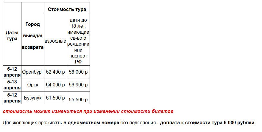 Возможны изменения в программе по причинам, не зависящим от компании, в пределах указанной стоимости.